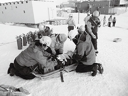 南極での自然環境として、まず思い浮かぶのが低温であると思います。低温によって生じる医療面での問題は凍傷と低体温症があります。凍傷にはI-II度の表在性の凍傷は多くの場合後遺障害を残すことなく治癒しますが、III-IV度の深達性の凍傷は何らかの形で組織の損傷を残すことが多いです。昭和基地は南極でも比較的「穏やかな」気候の地域になりますが、それでも冬季は−40℃になり、素手で屋外の金属を触れると一瞬で凍傷になります。実際私も屋外に出していたカメラ三脚を屋内に持ち込んだあと素手で触ってしまい、I度の凍傷になりました。熱傷の初期治療に冷水での冷却が推奨されているのと同様に、凍傷の局所治療としては温水での加温が最も良いとされています。しかし凍傷の部位に熱傷を来した場合と、いったん解凍した後に再度凍結するほどの寒冷条件にさらした場合は、組織のダメージが非常に強いとされているので、温水解凍は熱傷を起こさないように温水のしっかりした温度管理ができる設備と患部を再凍結させない温かい環境が十分に確保されたうえで行うべきです。